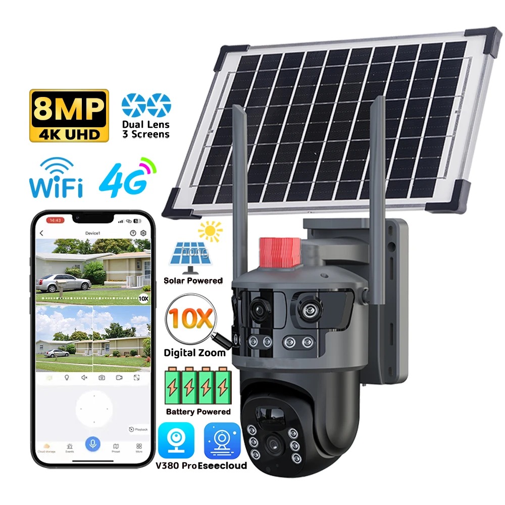 AI 4G solarna kamera 2u1 je idealno rešenje za video nadzor lokacija gde nema struje ni WiFi mreže. Zahvaljujući 4G konekciji, snažnom solarnom panelu od 7.5W i četiri 18650 baterije, kamera radi potpuno autonomno i pouzdano 24/7.