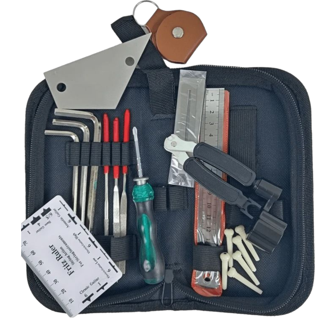 Komplet alata za podešavanje gitare je neophodan za svakog gitaristu, bilo da ste profesionalac ili početnik. Ovaj set uključuje 13 pažljivo dizajniranih alata koji omogućavaju precizno podešavanje vašeg instrumenta prema vašim željama. Komplet je savršen za sve vrste gitara i pruža vam sve što vam je potrebno za održavanje i optimizaciju zvuka vaše gitare.. Karakteristike:. 13 delova: Uključuje ključeve za podešavanje visine pragova, šrafciger za podešavanje visine mosta, ključeve za podešavanje visine vrata gitare i druge alate.. Praktična futrola: Omogućava sigurno čuvanje i lak transport svih alata.. Preciznost: Svaki alat je dizajniran da omogući precizno podešavanje gitare prema individualnim potrebama gitariste.. Kvalitetan dizajn: Alati su napravljeni od izdržljivih materijala, čineći komplet dugotrajnim i pouzdanim.. Svestranost: Idealno za profesionalne muzičare, kao i početnike koji žele samostalno da održavaju svoj instrument.. Komplet alata za gitaru omogućava gitaristima da samostalno vrše osnovne popravke i podešavanja, štedeći tako vreme i novac koji bi inače potrošili na odlazak kod majstora. Bilo da želite da poboljšate zvuk svog instrumenta ili da ga prilagodite svom stilu sviranja, ovaj set će vam olakšati posao.. Prikazana cena uključuje PDV!. Napominjemo da se angažujemo kako bismo pružili najprecizniji opis proizvoda uz detaljne slike i cene. Međutim, moramo istaći da ne možemo garantovati potpunu tačnost svih informacija bez eventualnih grešaka.
