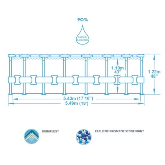 U sklopu ovog porodičnog bazena sa čeličnom konstrukcijom dolazi kompletna oprema koja uključuje filter-pumpu protoka 5678 l/h, prekrivač za bazen koji štiti vodu od ulaska nečistoće i prašine kada se bazen ne koristi, kao i merdevine radi lakšeg ulaska i izlaska iz bazena. Bazen takođe poseduje ventil za odvod vode, olakšavajući proces pražnjenja bazena. Montaža bazena je laka i jednostavna, bez potrebe za dodatnim alatom.