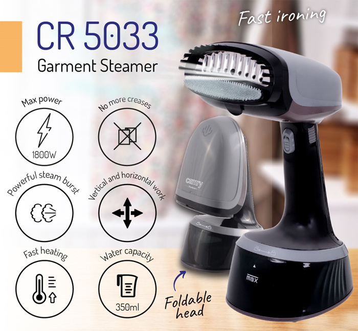 Pegla za vertikalno peglanje Camry CR5033 je pegla koja omogućava vertikalno i horizontalno peglanje odeće. Niko (uglavnom) ne voli da pegla, ali je neophodno kako bi odeća koju nosimo izgledala uredno. Pegla za vertikalno peglanje Camry CR5033 olakšava peglanje odeće. Postavite odeću na ofinger, napunite rezervoar pegle vodom i uključite aparat. Pegla se brzo zagreva, a para koja izlazi iz pegle je vrela i sa lakoćom ispravlja nabore na odeći. Pegla za vertikalno peglanje Camry CR5033 je nominalne snage 1200W, a kapacitet rezervoara je 350ml. Kompaktni dizajn olakšava odlaganje pegle.