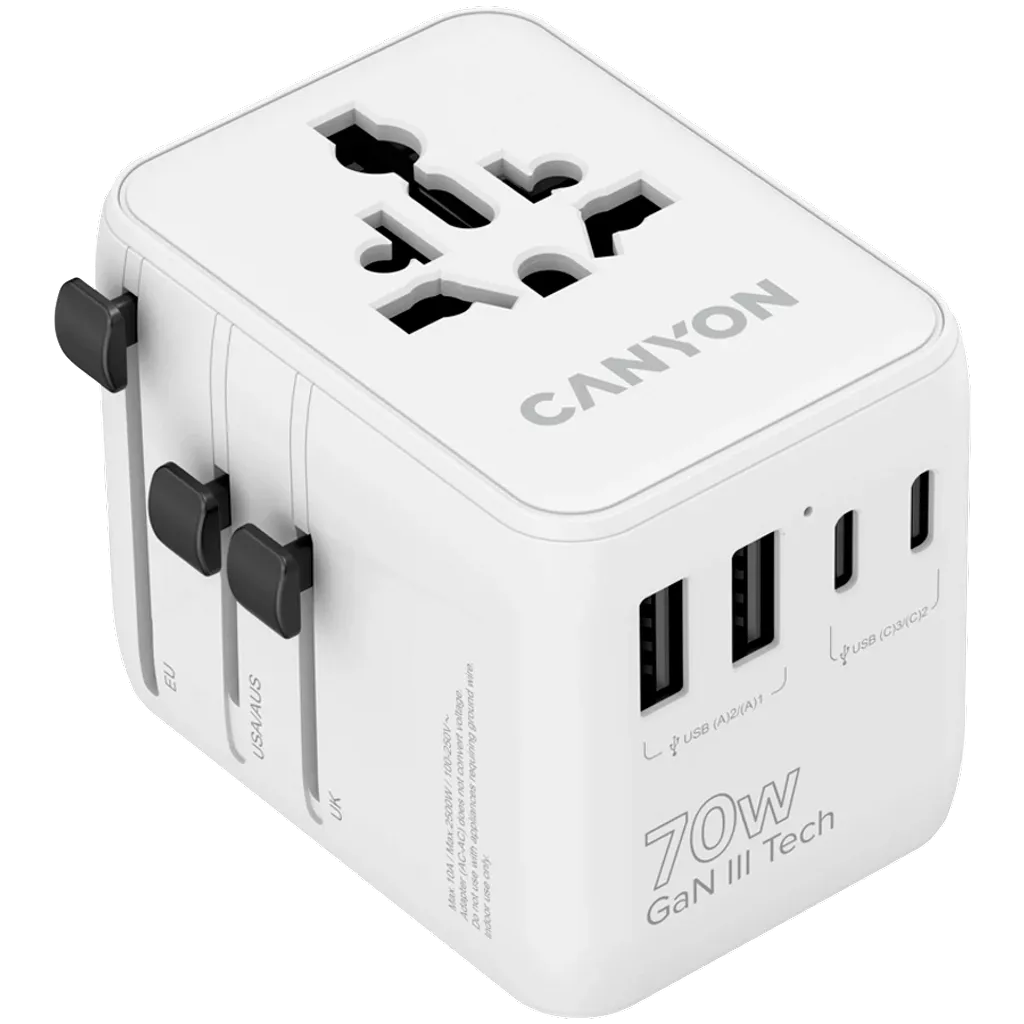 CANYON OnTour 70 univerzalni putni adapter omogućava sigurno i brzo punjenje uređaja u više od 200 zemalja. Sa 3 USB-C i 2 USB-A porta, dvostrukim AC utičnicama (EU, UK, US, AUS) i GaN III tehnologijom, idealan je za putovanja i poslovne korisnike. Kompaktan, lagan i sa LED indikatorom, pruža pouzdanu zaštitu od preopterećenja, prenapona i kratkih spojeva.