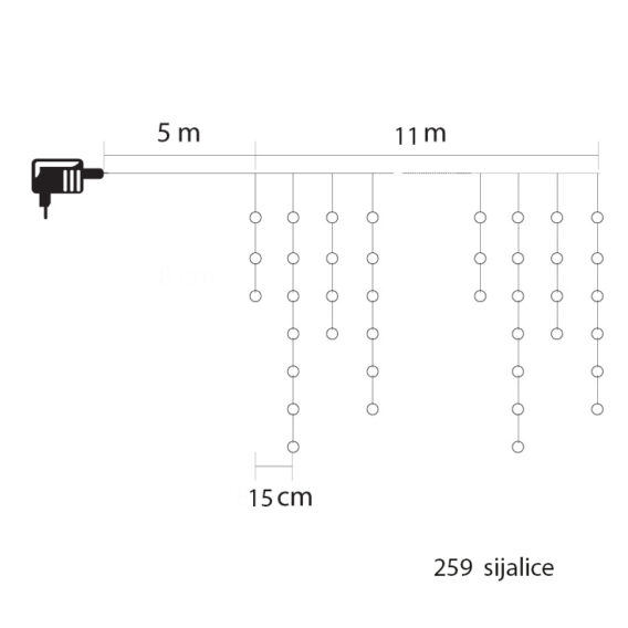 Sa toplom belom svetlošću i 259 LED lampica koje nežno svetlucaju (twinkle efektom), ovaj svetleći niz unosi praznični duh u svaki prostor. Idealan za spoljašnju dekoraciju fasada, terasa i dvorišta, ali podjednako pogodan za unutrašnje ukrašavanje vašeg doma, ovaj niz pruža savršen balans elegancije i funkcionalnosti.