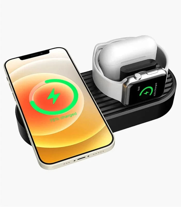 Postolje za bežični punjač. Unesite savršen organizacijski dodatak za svoj prostor uz gumeno postolje za bežično punjenje. Ovaj multifunkcionalni proizvod dizajniran je da unapredi vaš radni sto, noćni ormarić ili bilo koji prostor gde punite svoje Apple uređaje. Svojim funkcionalnostima i kvalitetom, postolje nudi efikasno rešenje za svaki Apple punjač.. Ključne karakteristike:. Univerzalna kompatibilnot: Savršeno se uklapa sa Apple punjačima za iPhone, AirPods i Apple Watch.. Držač za Iphone: Specijalno oblikovan držač koji omogućava sigurno punjenje i čuvanje vašeg telefona.. Držač za Apple Watch: Držač za Apple Watch omogućava lak pristup vašem pametnom satu kad god vam zatreba.. Držač za AirPods: Pruža savršen prostor za vaše bežične slušalice, čineći ih uvek spremnim za upotrebu.. Antiklizajuća guma: Kvalitetna guma štiti površine od ogrebotina i osigurava stabilnost uređaja tokom punjenja.. Lako prenosivo: Kompaktan dizajn čini postolje idealnim za putovanja i korišćenje na različitim mestima.. Stilski dizajn: Elegantan izgled savršeno se uklapa u Apple estetiku, čineći ga atraktivnim i praktičnim dodatkom.. Specifikacije:. Naziv modela: A 15. Materijal: Silikon/Guma. Boja: Crna. Dimenzije: 170 x 70 x 61 mm. Prikazana cena uključuje PDV!. Napominjemo da se angažujemo kako bismo pružili najprecizniji opis proizvoda uz detaljne slike i cene. Međutim, moramo istaći da ne možemo garantovati potpunu tačnost svih informacija bez eventualnih grešaka.