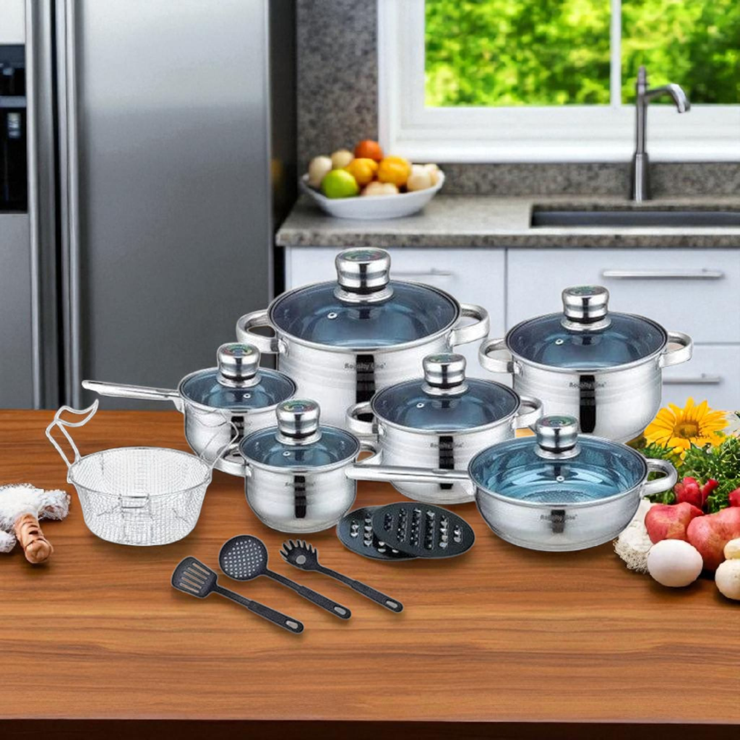 Royalty Line RL-1801B set posuđa – kompletno posuđe za svaku kuhinju. Savremena kuhinja zahteva pouzdano, funkcionalno i dugotrajno posuđe. Bilo da tek započinjete kulinarske avanture ili ste iskusni kuvar, pravi komplet šerpi i tiganja može napraviti veliku razliku u svakodnevnom kuvanju. Royalty Line RL-1801B set posuđa sastoji se od čak 18 delova, pažljivo osmišljenih da odgovore na sve vaše potrebe – od pripreme supa i sosova, preko pečenja i dinstanja, do prženja i posluživanja.. Kvalitetan materijal – inox nerđajući čelik. Osnovu ovog kompleta čini nerđajući čelik vrhunskog kvaliteta. Ovaj materijal donosi brojne prednosti:. Otpornost na koroziju i habanje – posuđe će dugo zadržati sjaj i funkcionalnost.. Higijenski bezbedan – ne upija mirise i ukuse hrane.. Jednostavno održavanje – lako se pere i može se prati u mašini za sudove.. Inox šerpe i tiganj su idealni i za svakodnevnu upotrebu i za pripremu specijalnih jela, a zahvaljujući svom elegantnom dizajnu uklapaju se u svaku kuhinju.. Višeslojno dno za ravnomerno kuvanje. Jedna od glavnih prednosti Royalty Line RL-1801B seta je 7-slojno dno koje omogućava ravnomernu raspodelu toplote. To znači da se hrana kuva podjednako sa svih strana, bez zagorevanja i nepotrebnog gubitka hranljivih materija.. Osim toga, višeslojno dno pomaže u očuvanju energije, jer duže zadržava toplotu, pa se jela mogu nastaviti lagano krčkati i nakon gašenja ringle.. Precizna kontrola kuvanja – termo regulator. Set posuđa RL-1801B opremljen je termo regulatorom koji omogućava precizno praćenje i kontrolu temperature tokom kuvanja. Ovo je posebno korisno za jela koja zahtevaju tačnu termičku obradu – poput sosova, krem supa ili specijaliteta koji se lagano dinstaju.. Kompletan set – sve što vam treba u jednom paketu. Royalty Line RL-1801B uključuje:. Šerpa Ø 24 cm – 6,3 l – velika šerpa za supe, čorbe i jela za celu porodicu.. Šerpa Ø 20 cm – 3,9 l – odlična za variva, krompir i kuvana jela.. Šerpa Ø 18 cm – 2,9 l – praktična za sosove i manje obroke.. Šerpa Ø 16 cm – 1,9 l – pogodna za mleko, priloge i male porcije.. Šerpa sa drškom Ø 16 cm – 1,9 l – idealna za brzo podgrevanje ili male količine hrane.. Tiganj Ø 24 cm – za prženje, pečenje i pripremu brzih jela.. Korpica za prženje – praktična za pomfrit, krofne i druge pržene specijalitete.. Dva podmetača – za zaštitu radne površine i praktično serviranje.. Pribor za kuvanje – dodatni alati koji olakšavaju svakodnevnu pripremu jela.. Ovaj set predstavlja sveobuhvatno rešenje za svaku kuhinju – više ne morate kupovati dodatne šerpe ili tiganje jer imate sve na jednom mestu.. Stakleni poklopci sa odvodom za paru. Sve šerpe i tiganj dolaze sa staklenim poklopcima koji imaju otvor za paru. Na taj način možete lako pratiti proces kuvanja bez podizanja poklopca, dok se višak pare oslobađa kontrolisano, sprečavajući prelivanje.. Prednosti Royalty Line RL-1801B seta. Komplet od 18 delova – šerpe, tiganj, pribor i dodaci.. Inox materijal – izdržljiv, otporan i elegantan.. 7-slojno dno – brzo i ravnomerno kuvanje.. Termo regulator – precizna kontrola temperature.. Kompatibilnost – može se koristiti na svim vrstama ploča (plinskim, električnim, indukcionim, keramičkim).. Lako održavanje – pogodno za pranje u mašini.. Praktičnost za svakodnevni i profesionalni rad. Royalty Line RL-1801B nije samo set posuđa za domaćinstva. Zahvaljujući svojoj svestranosti i velikom broju komada, odličan je i za profesionalne kuhinje, manje restorane ili ketering. Velike šerpe olakšavaju pripremu obroka za više osoba, dok manji elementi pomažu kod brzih i specijalizovanih jela.. Za koga je idealan ovaj set posuđa?. Porodice – jer pokriva sve potrebe za svakodnevne obroke.. Mlade parove – kao odličan izbor za useljenje ili prvi dom.. Profesionalne kuvare – zbog svestranosti i broja elemenata.. Poklon – savršen za venčanja, godišnjice ili posebne prilike.. Recenzije korisnika. Korisnici ističu da je RL-1801B set praktičan, kvalitetan i izuzetno funkcionalan. Posebno se hvali višeslojno dno koje sprečava zagorevanje, kao i termo regulator za precizno kuvanje. Mnogi ga preporučuju kao idealan komplet za one koji žele da imaju sve u jednom setu.. Royalty Line RL-1801B set posuđa predstavlja savršeno rešenje za sve koji žele kvalitet, dugotrajnost i praktičnost u kuhinji. Sa šest različitih šerpi, tiganjem, priborom i dodatnim elementima, ovaj set pokriva sve što vam je potrebno za svakodnevno kuvanje i pripremu specijalnih jela.. Ako tražite set posuđa koji kombinuje funkcionalnost i eleganciju, RL-1801B je pravi izbor. Njegova inox izrada, višeslojno dno i dodatni elementi čine ga investicijom koja će se isplatiti i trajati godinama.